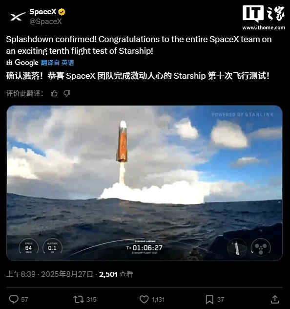 IT之家 8 月 27 日消息,连续两天推迟发射后,SpaceX 新一代重型运载火箭“星舰”于美国中部时间 8 月 26 日 18 时 30 分从得克萨斯州发射升空,实施第十次试飞。此次任务重点目标包括让飞船部署模拟卫星、在太空中进行发动机重新点火测试等。按计划,火箭助推器将落入墨西哥湾区域,不返回发射场。